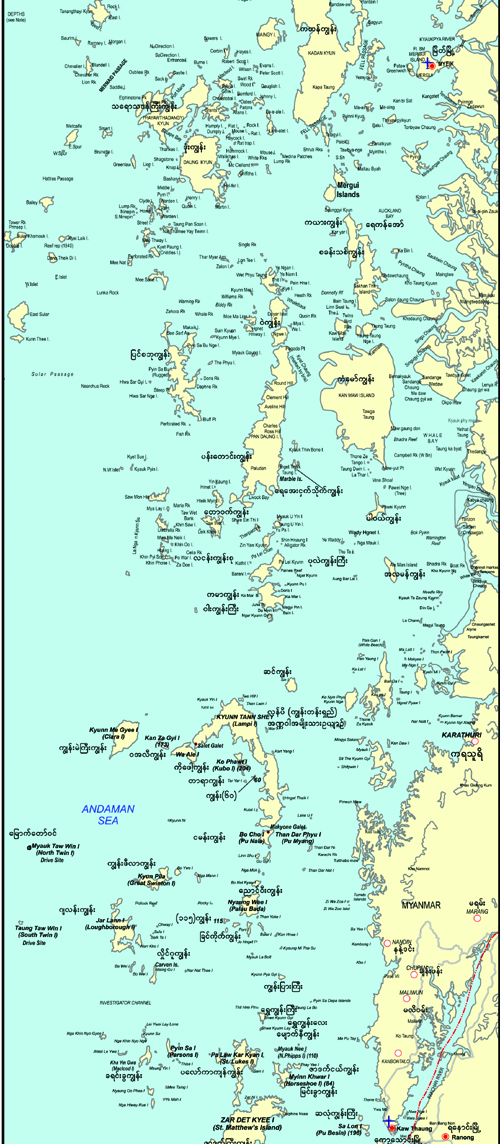 Kawthaung – Kyet Mauk I (Cock’s Comb) – Say Tan I (Dunkin I) – Nyaung Oo Phee I – Kha Yin Gwa (Maclcod I) – Lei Ywei Lay Lone (Cock Burn ) – Rhino Horn Island – Myauk Nee I (N.Phipps) – Thay Yee Island – Kawthaung.